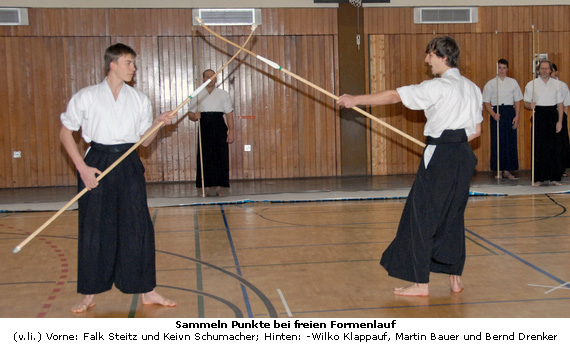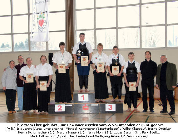 Beim Wettbewerb im freien Formenlauf zeigten die angetretenen Naginataka anmutig ihr Können. Im Jeder-gegen-Jeden-Modus mussten die Teilnehmer die akkurate Handhabung der Schwertlanze beweisen. Die Newcomer Bernd Drenker (93 Pkt.) und Wilko Klappauf (98 Pkt.) zeigten, dass man bereits innerhalb eines halben Jahres Training durchaus eindrucksvoll mithalten kann. Auch Falk Steitz (154 Pkt.), der schon länger bei den Egelsbacher Naginataka dabei ist, zeigte große Fortschritte im heimischen Jojo. Nur sechs Punkte in der Gesamtwertung trennten Lucas Jaron (156 Pkt.) und Yanis Mohr (163 Pkt.). Beide teilten sich den 3. Platz beim diesjährigen Vereinsvergleich. Richtig knapp wurde es noch nochmal, als es um den ersten Platz ging. Kevin Schumacher und Martin Bauer lieferten sich ein wahres Kopf-an-Kopf-Rennen um die beste Platzierung. Nur ein Punkt trennte die beiden Favoriten, so dass am Ende Kevin, der Vereinsmeister von 2009, mit 168 Punkten den Kürzeren zog und den 2. Platz eroberte. Mit fetten 169 Punkten wurde Martin Bauer neuer SGE-Vereinsmeister 2010.