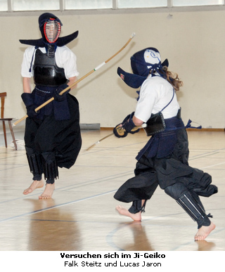 Damit auch in diesem Jahr wieder Neues für Teilnehmer und Publikum auf dem Programm stand, wurde abschließend noch ein beeindruckendes Ji-Geiko, eine Übungskampf in Rüstung, veranstaltet. Teil nahmen daran Falk Steitz, Lucas Jaron und Martin Bauer. Wie erwartet konnte jedoch keiner der angetretenen Recken einen korrekten Treffer landen, so dass das Resümee nur lauten kann: Weiter üben, üben und nochmals üben...