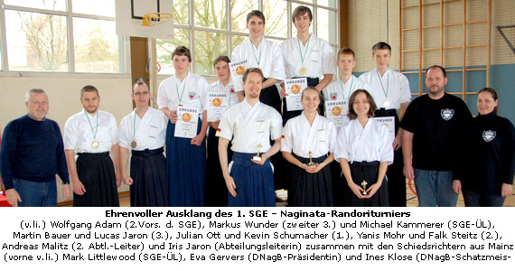 Dank einer großzügigen Spende der Stadtwerke Langen konnten alle Naginatakämpfer mit Medaillen für ihre guten Leistungen belohnt werden. Bei der Siegerehrung die vom 2. Vorsitzenden der SGE Wolfgang Adam und dem stellvertretenden Abteilungsleiter Andreas Malitz vorgenommen wurde, erreichte das Team Michael Kammerer und Markus Wunder, der erst seit wenigen Monaten zur Truppe der SGE gehört, einen guten zweiten 3. Platz. Das Team Martin Bauer und Lucas Jaron erreichte 10 Punkte und nahmen Bronze für ihre Ausführung der verlangten Engi-Formen entgegen. Für Überraschung sorgte das junge Team Falk Steitz und Yanis Mohr, als es sich mit einer Unterbewertung von 15 Punkten den 2. Platz sicherte. Erste des Turniers wurde das Team Kevin Schumacher und Julian Ott. Mit äußerster Konzentration und der nötigen Ruhe setzten die beiden Kämpfer ihre Schläge an und trafen Punkt genau alle Trefferstellen. Das Team erhielt zudem den Titel "Vereinsbeste 2009" und wird diesen beim den 4. Kampfsporttagen Ende November 2010 verteidigen müssen.