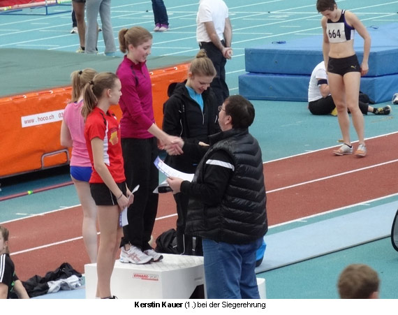 Für Carolin Kraus war es ein recht starkes Teilnehmerfeld über die 400m Frauen. Carolin wurde dort 5. in 58,98sec, womit sie sehr zufrieden war, denn sie konnte ihre Hallenbestzeit um 1,5sec. verbessern. Auf den 200m Lauf allerdings schaute sie wieder mal sehr kritisch. Mit dieser Strecke ist sie in der Halle selten so richtig zufrieden, obwohl die Zeit von 26,69sec. ordentlich war, denn sie kam damit nah an ihre Hallenbestzeit.