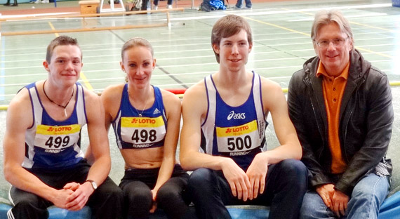 So sehen Sieger aus - (v.li.) Fabian Rühl (1./200m, 13./60m), Carolin Kraus (7./200m, 5./400m) und Michael Werner (2./1,90m) mit Trainer Stafan Bareuther
