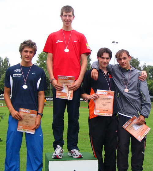 Im Hochsprung der männlichen Jugend ging Michael Werner in der höheren Altersklasse an den Start. Alle waren gespannt, ob sich Michael nach dem bisher schlechten Saisonstart steigern konnte. Schon beim Einspringen war zu erkennen, dass er einen guten Tag erwischt hatte. Die ersten Sprunghöhen meisterte er ohne Probleme, mit teilweise tollen Sprüngen. Schnell wurde klar, dass der Wettkampf in einem Zweikampf, zwischen ihm und dem zwei Jahre älteren Stefan Göbel vom Hünfelder SV, endet würde. Ab der Sprunghöhe von 1,90 m startet das Duell der beiden Springer um den Sieg und es entwickelte sich ein durch Spannung nicht zu überbietender Showdown. Beide Springer überquerten sowohl die 1,93er Marke als auch die Höhe von 1,96 m. Dies war für Michael die Einstellung seiner neuen Bestleistung und bedeutete gleichzeitig die Qualifikation zur Deutschen Meisterschaft. Nachdem beide Springer dann drei Mal an der nächsten Sprunghöhe von 1,99m scheiterten, musste auf Grund der gleichen Anzahl Fehlversuche, ein Stechen über den Sieg entscheiden. Erst im 4. Sprung konnte sich Stefan Göbel gegen Michael durchsetzen. Für den weiteren Verlauf der Saison wird dieses Ergebnis Michael jedoch eine noch größere Portion Motivation geben. Für diesen Wettkampf durfte er sich mit dem Vizemeistertitel zu frieden geben.