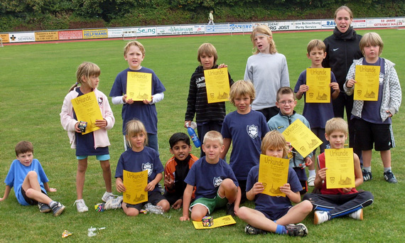 Bei den Teamnamen hatte man sich wieder originelle Bezeichnungen wie "Prinz von Homburg", "Sporthasen" oder "Der grüne Blitz" einfallen lassen. Die jungen Athletinnen und Athleten gingen wie bereits im Frühjahr in der Halle mit Feuereifer ans Werk, kam es doch darauf an, mit der eigenen Mannschaft möglichst viele Punkte zu sammeln, sei es, eine möglichst weite Zone beim Sprint oder beim Tennisballschleudern zu erreichen oder aus dem Stand bei 3 möglichen Varianten am weitesten zu springen. Um das Sprintvermögen und die Körperkoordination ging es beim Lauf durch Fahrradreifen und Bananenkisten auf einer Wendestrecke. Und beim abschließenden Biathlonlauf ging es darum, die Ausdauerfähigkeit zu schulen, aber auch gleichzeitig um die Geschicklichkeit beim Werfen, indem Tennisbälle pro Laufrunde in Tonnen zu sammeln waren, die entsprechende Mannschaftspunkte ergaben. Es siegte das Team "Die schnellen Blau-Roten", einer Kombinationsmannschaft bestehend aus Sportlerinnen und Sportlern des SC 1880 Frankfurt und der SG Egelsbach vor dem "Tigerteam" des TSV Klein-Umstadt und der SG Egelsbach sowie dem Team